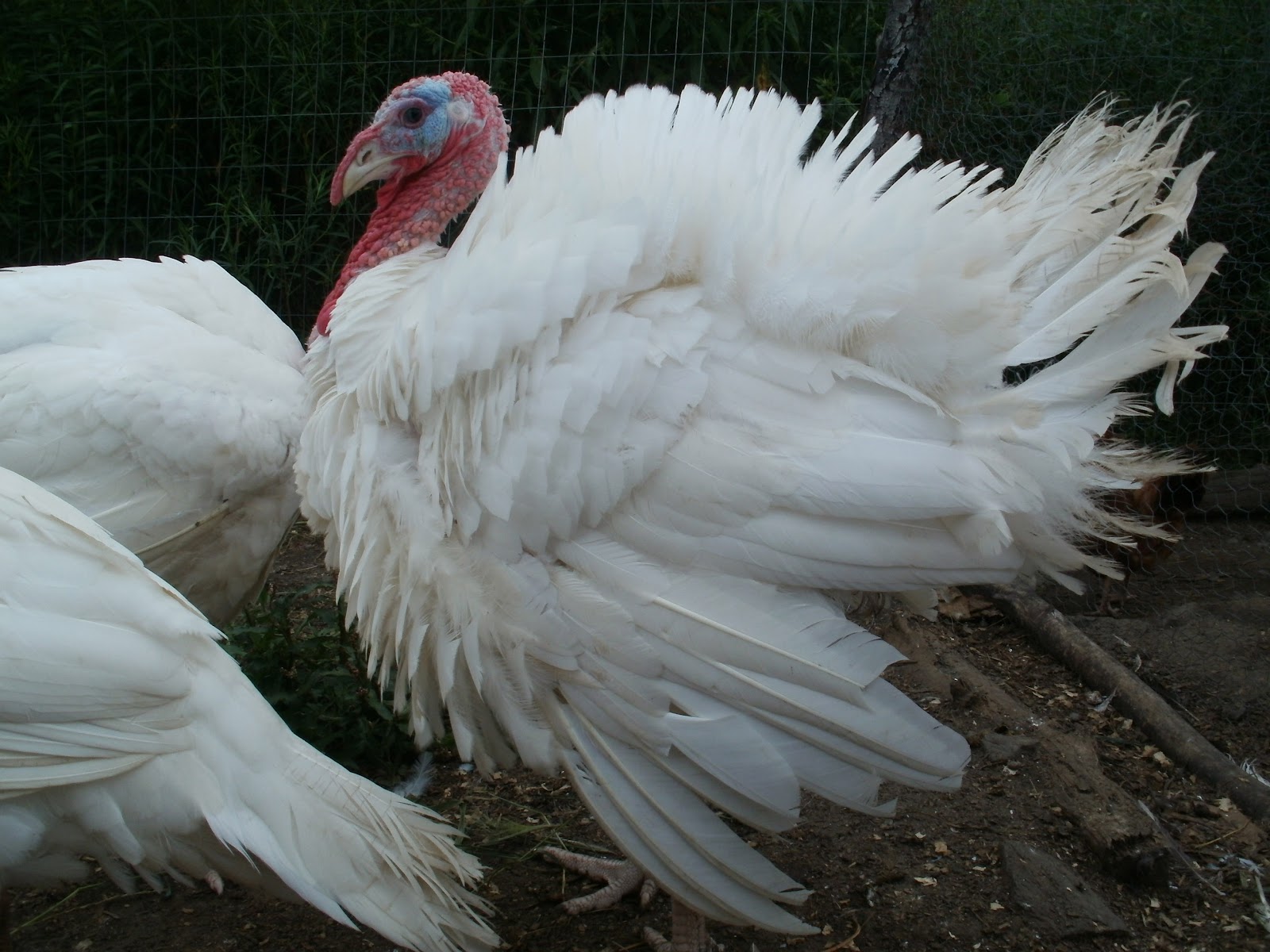 As for the turkeys, we thought we had one tom and two hens. But late last week, one of the 'hens' suddenly started looking more and more male. We don't know if this is normal or if he's just a late bloomer. So, we've got one tom, one hen, and one puzzle.
